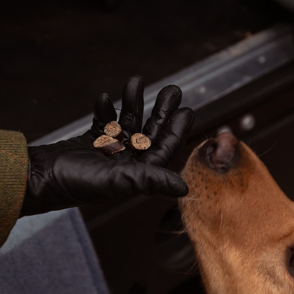 Crazy delicacy! Small delights, served in slices, making this the perfect highend training reward. Air-dried and handmade from A-Z in England, prepared with an abundance of deer and duck.